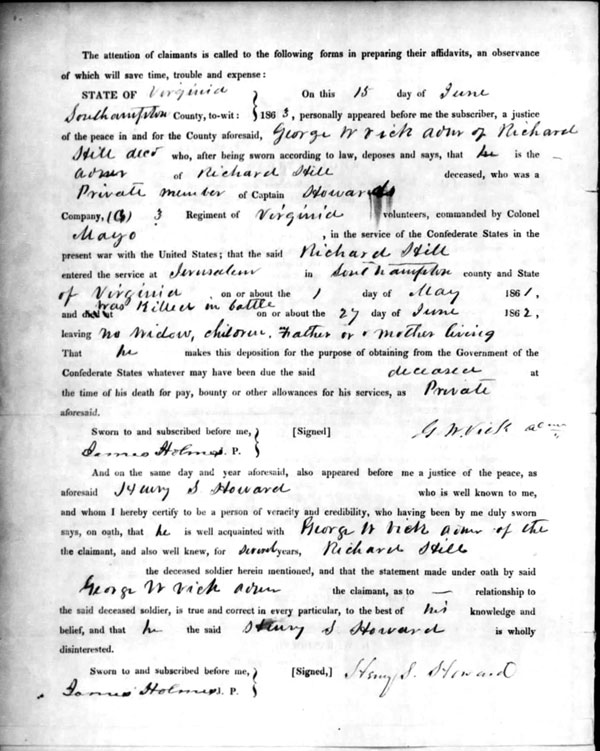 In the name of God amen, I William Hill of the Cunty of Southampton and State of Virginia being sick and weak in body but of sound mind and disposing memory for which I thank God and call to mind the uncertainty of human life and being desirous to dispose of all such worldly estate as it hath pleased God to bless me with.